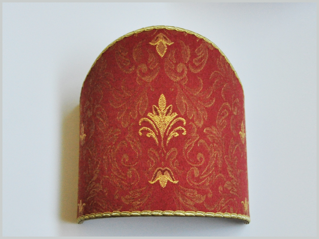 Ventoline modello scudo realizzate con tessuto damasco bordeaux e rifinite con bordino foglia oro.
